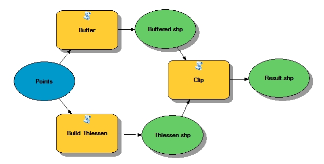 Now we need to find a way to split the buffers for all points created in STEP 1. with the Thiessen polygons and each original point will have its own buffer polygon.