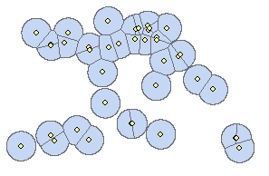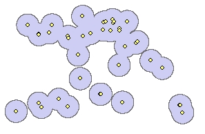 The question that we have to answer is how to partition the buffers created in this fashion so that each original feature gets its own buffer polygon.