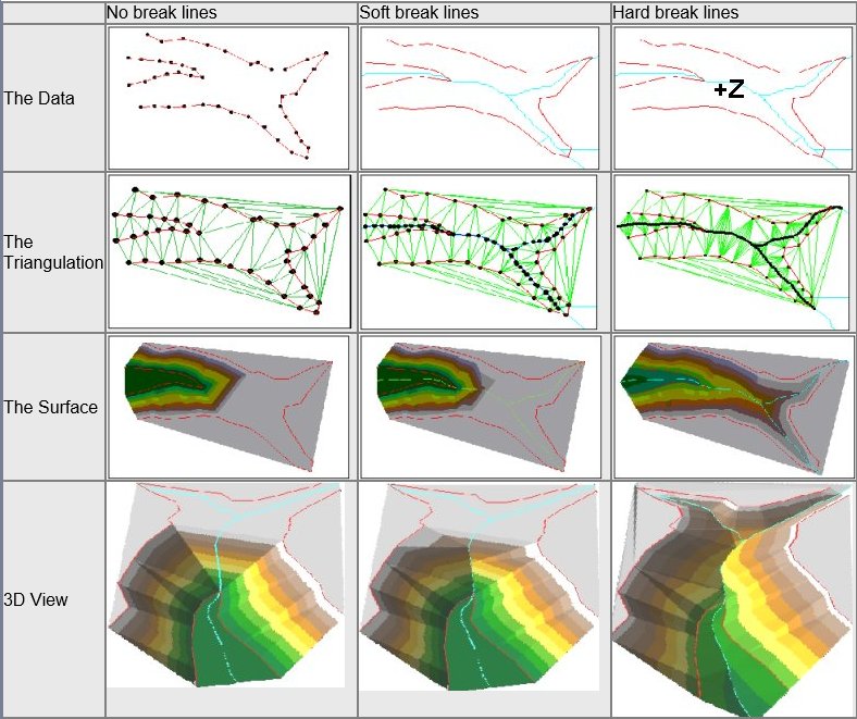 Linear features which define and control surface behavior in terms of smoothness and continuity are called break lines.